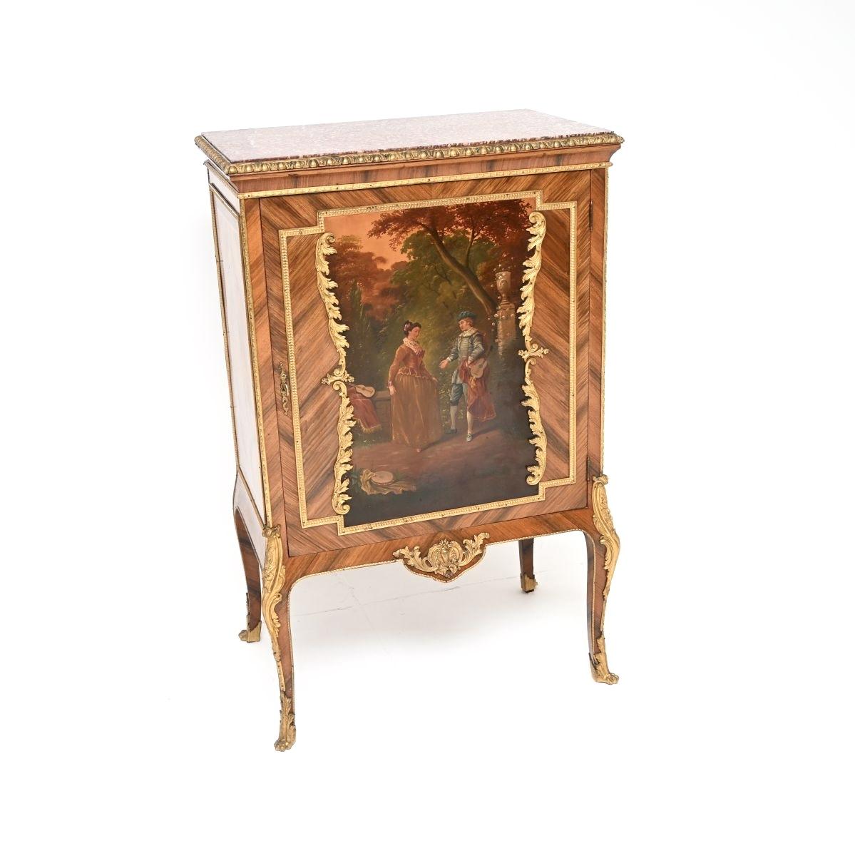 It is of superb quality, this is a useful size and has a gorgeous inset rouge marble top. The cabinet is predominantly kingwood, and has gorgeous oil painting on the front door. There are extremely high quality gilt bronze ormolu mounts with exceptionally fine details all over. The interior is beautifully fitted out with mirrors and adjustable glass shelves.
