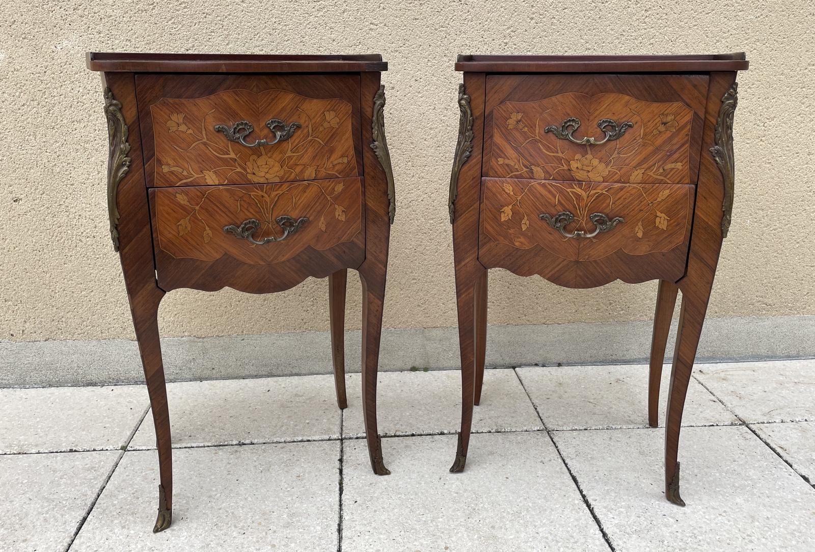 Antique French Marquetry Bombe Shape Bedside Tables Louis XVI Cabinets