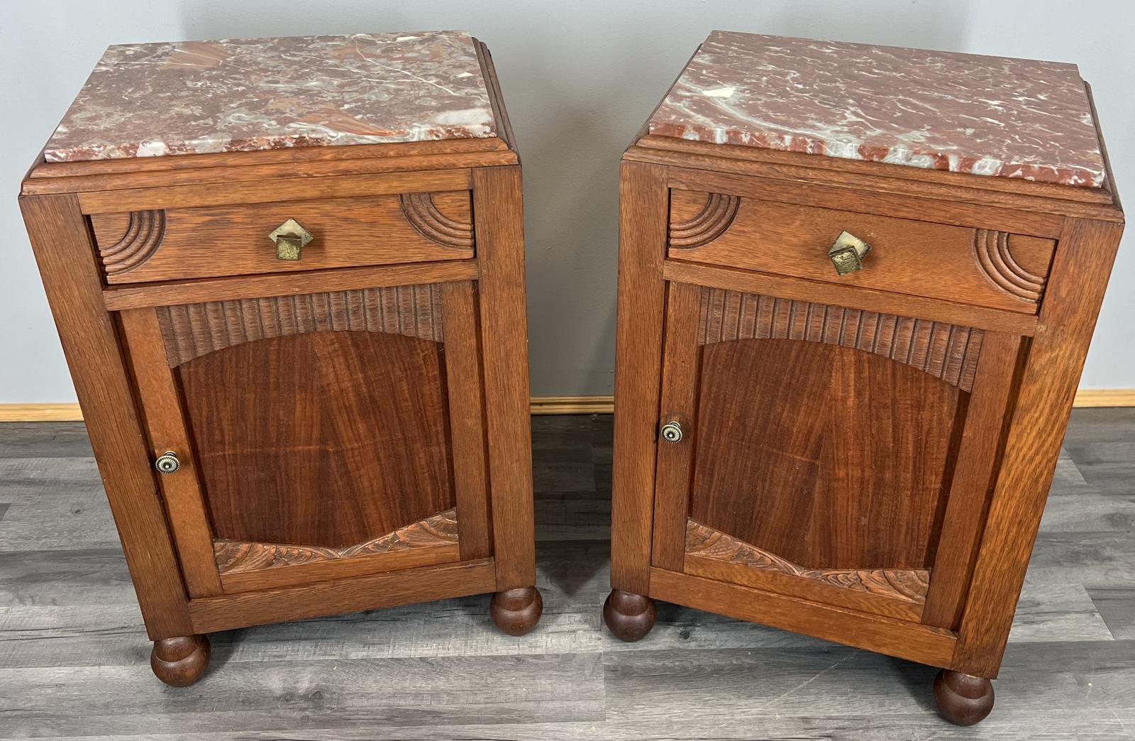 Antique French Oak Bedside Tables Pair Marble Top Cupboards Cabinets LOT 3930
