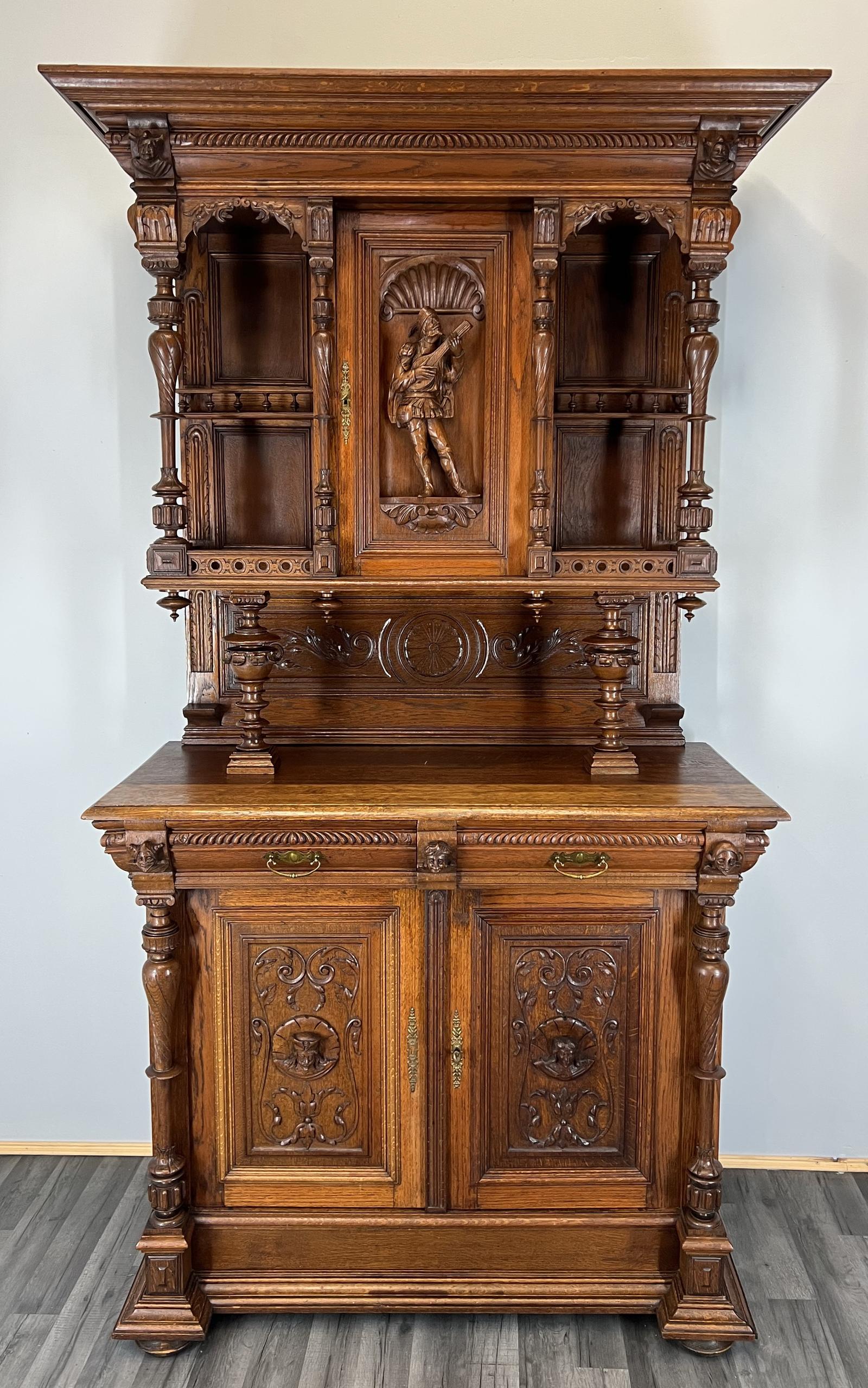 Antique French Oak Buffet Dresser Display Cabinet Carved Figurine
