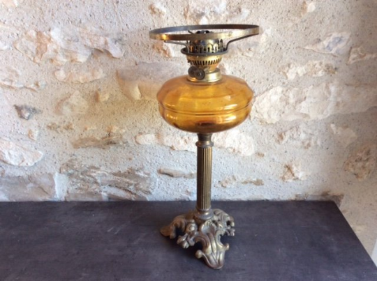 Antique French Oil Lamp on Brass Rocco Support & Amber Glass Reservoir
