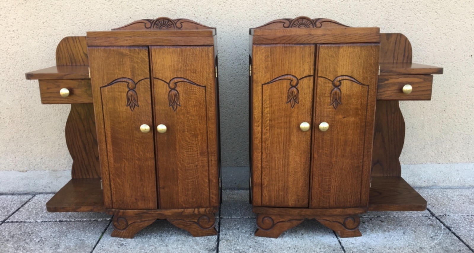 Antique French Pair of Bedside Night Stands Solid Oak Cupboards