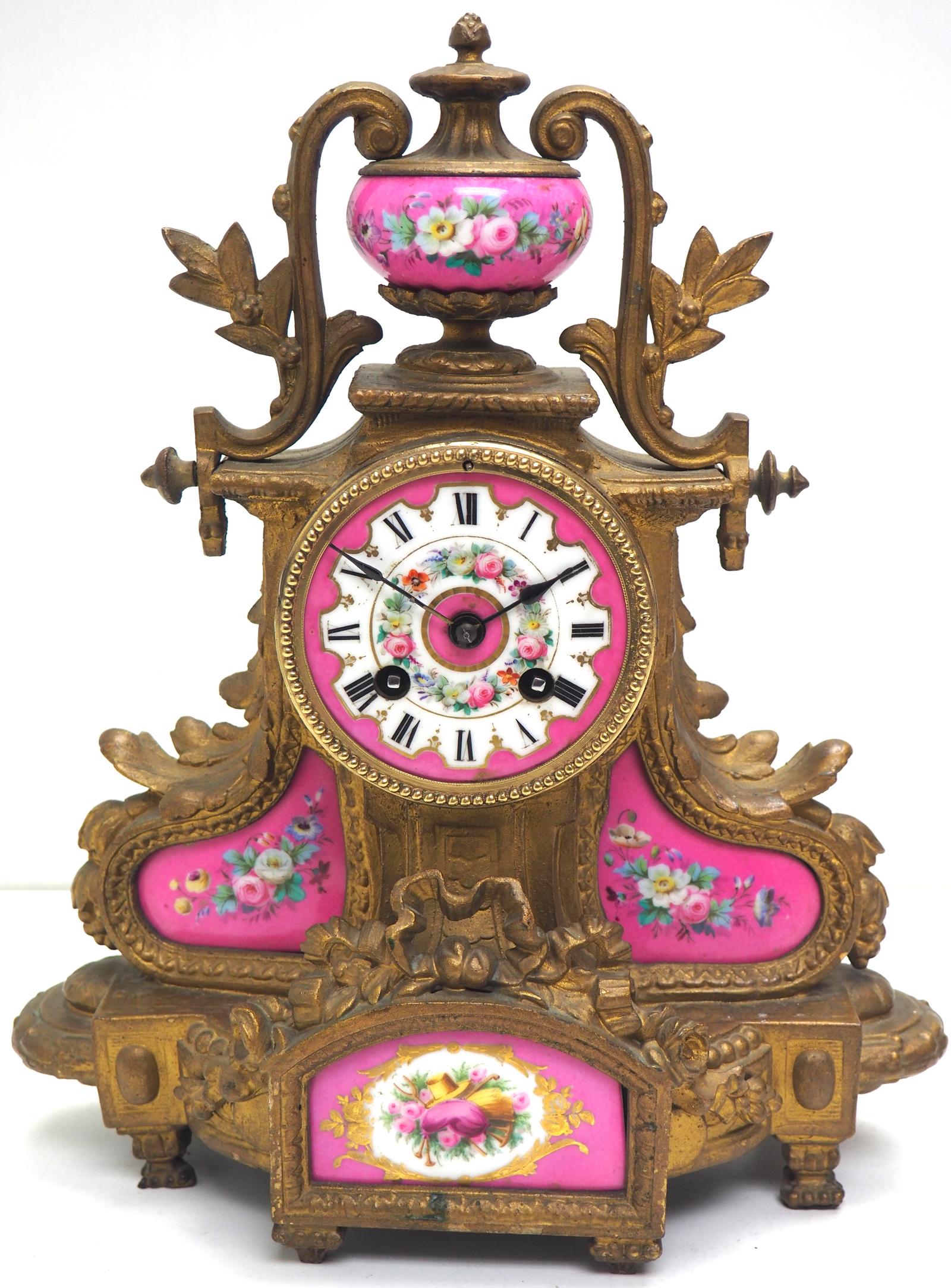 Antique French Pink Sevres 8-day Striking Gilt Mantle Clock c.1890