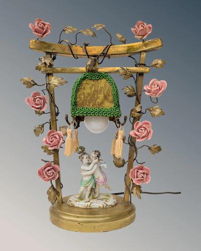 This is a delightful French porcelain and toleware table lamp with a really pretty design dating from around 1900. The lamp has central porcelain cherubs in an embrace set within a gilt bronze gate with entwined foliage and pretty floral porcelain blooms. The lamp has its original fabric covered shade with later tasselled decoration. This takes a standard bayonet fitting bulb and is rewired ready for use in the home.