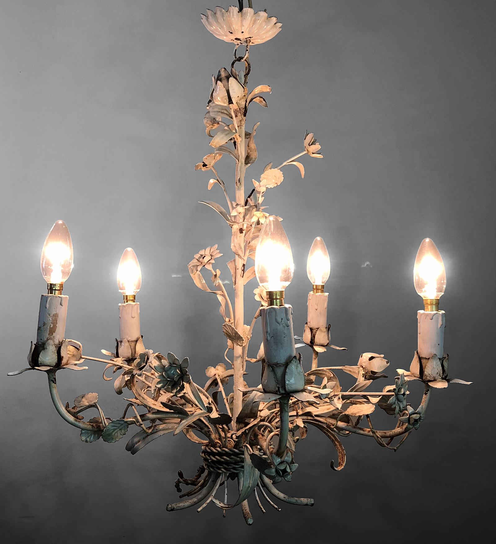 Antique French Rustic Shabby Chic Floral Toleware Ceiling Light Chandelier