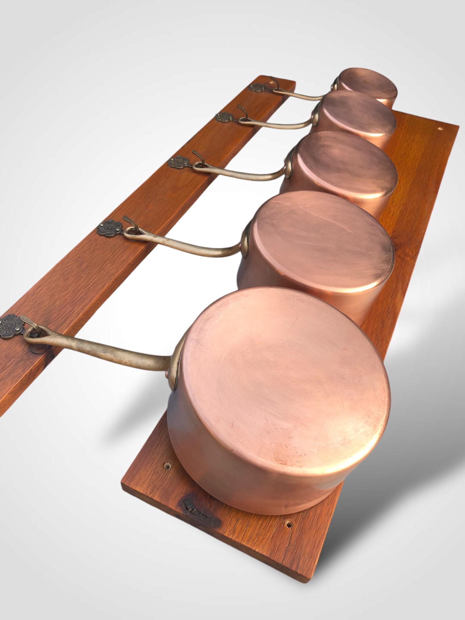 Antique French Set Of 5 Copper Pans Including Hanging Shelf