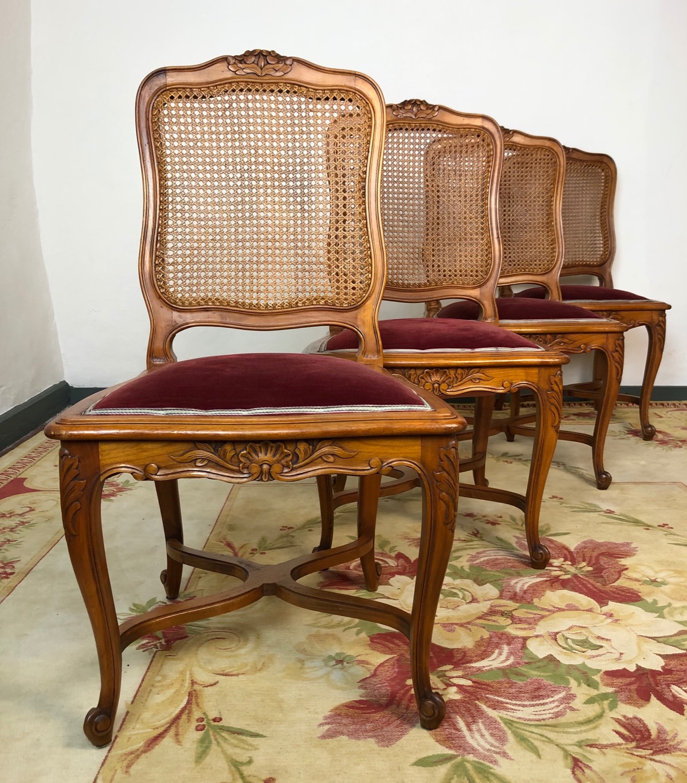Antique French Set of Four Bergère Cane Dining Chairs Louis XV Style