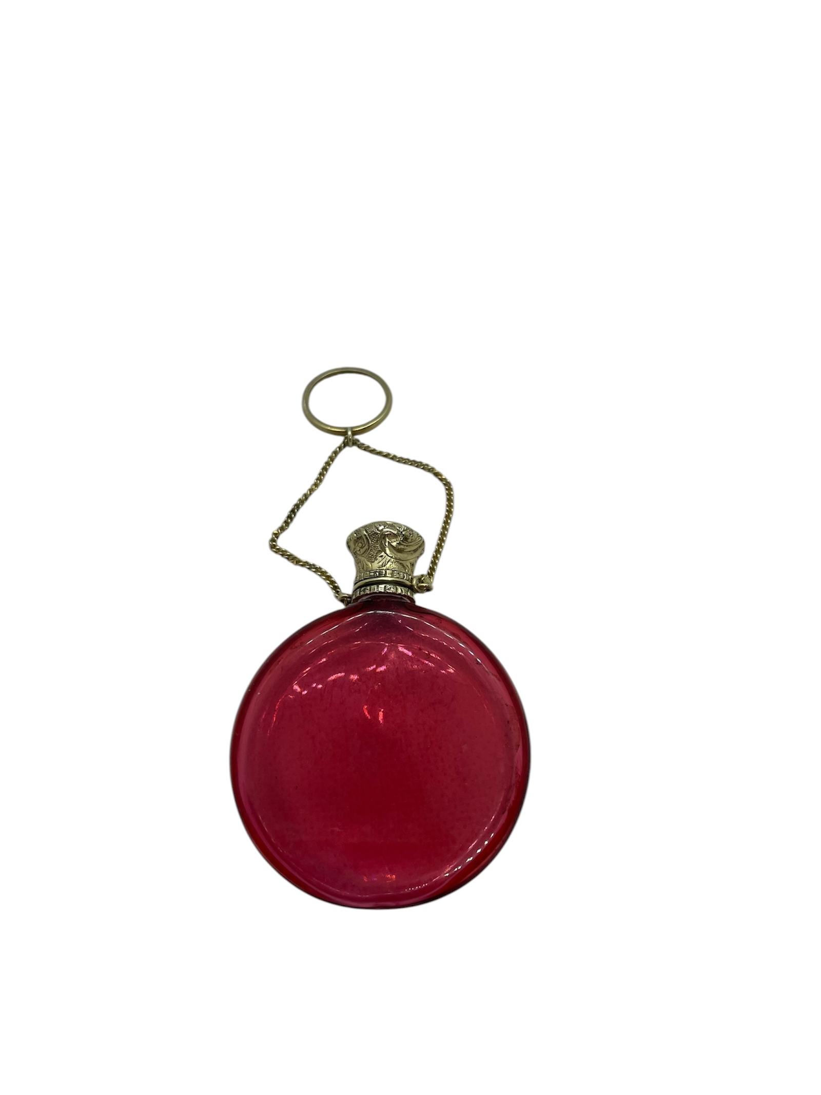 Beautiful antique Victorian silver gilt cranberry disc shaped chatelaine perfume bottle