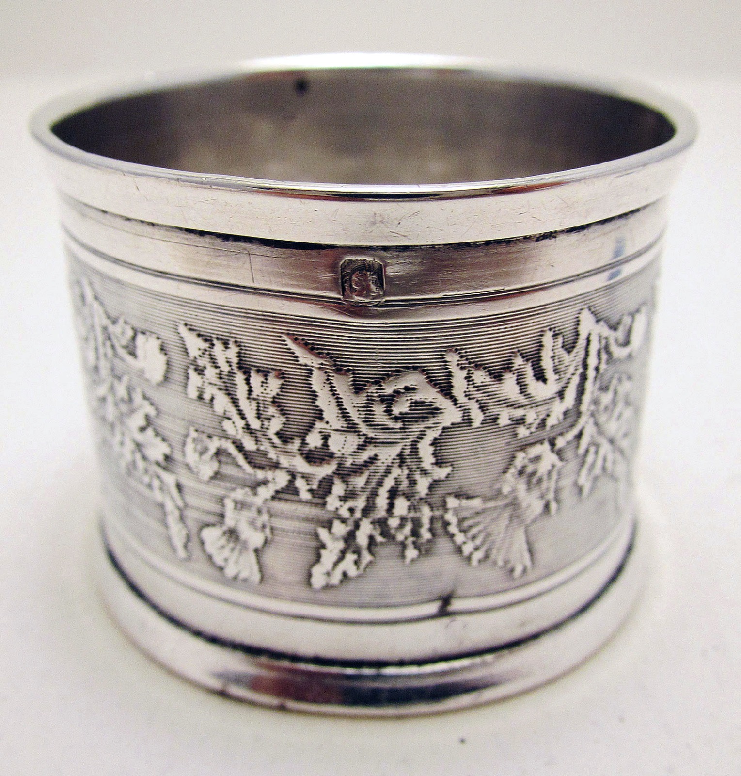Antique French Solid Sterling Silver Hallmarked Serviette Napkin Ring, Guilloche Thistle Flowers, Minerva .950 c.1890