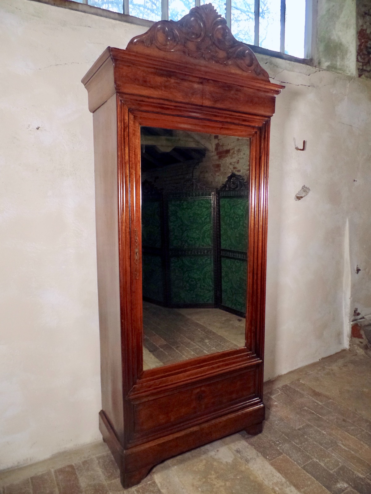 Antique French Walnut Armoire Mirror Fronted Shelves Drawers Carved Cupboard / Wardrobe