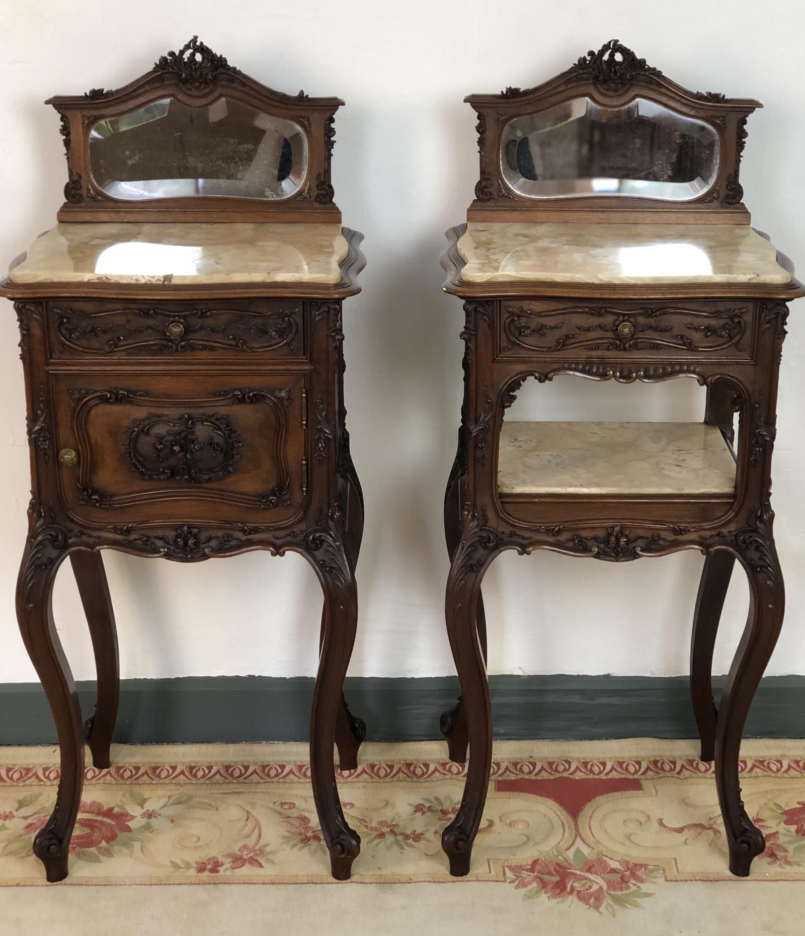 Antique French Walnut Bedside Cabinets Marble Tops & Mirrors Pot Cupboards
