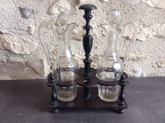 Antique French Wood & Cut Glass Table Oil & Vinaigrette Holder Complete Perfect Condition