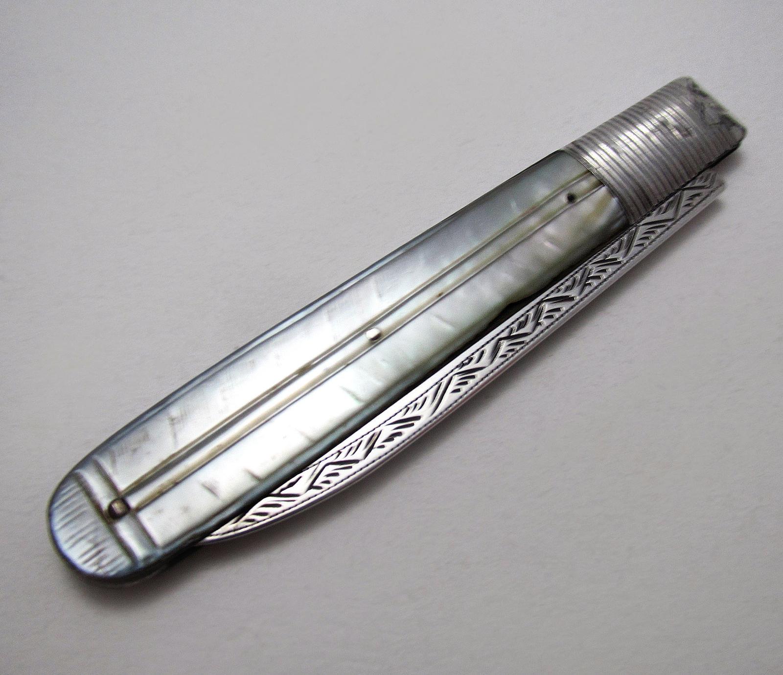 Antique George III (1786-1797) Sheffield Sterling Silver & Mother of Pearl Folding Fruit Knife