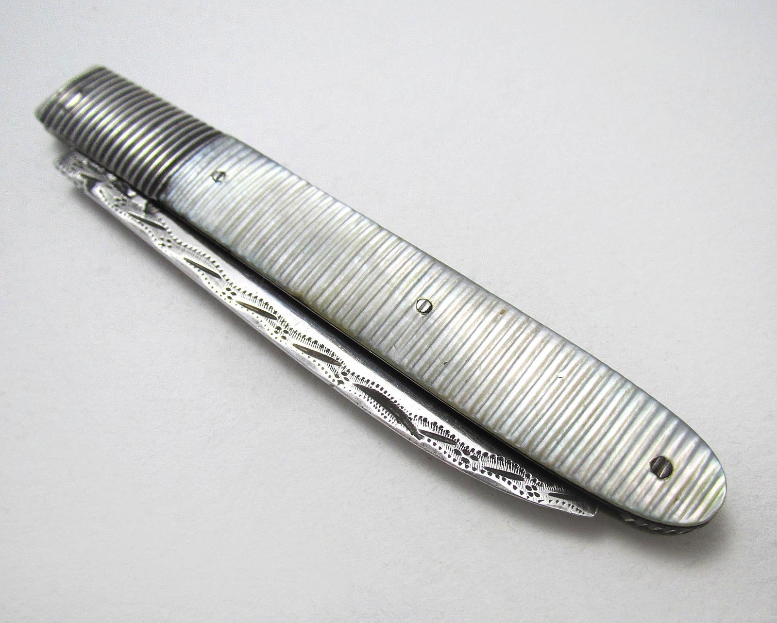 Antique George III (1786-1797) Sheffield Sterling Silver & Mother of Pearl Folding Fruit Knife with Bright-cut Engraved Blade