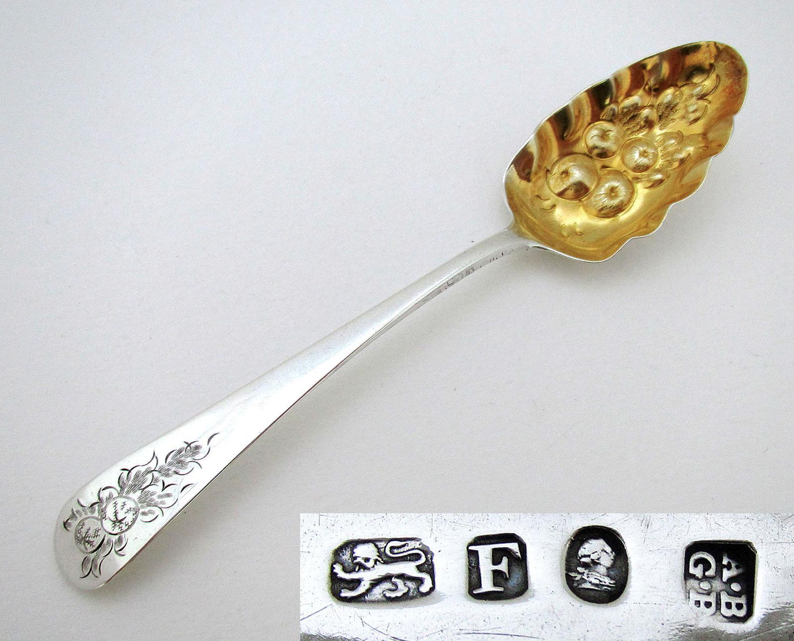 Antique George III 1801 Solid Sterling Silver Gilt English Georgian Tea Dessert Fruit Small Berry Spoon. Alice & George Burrows