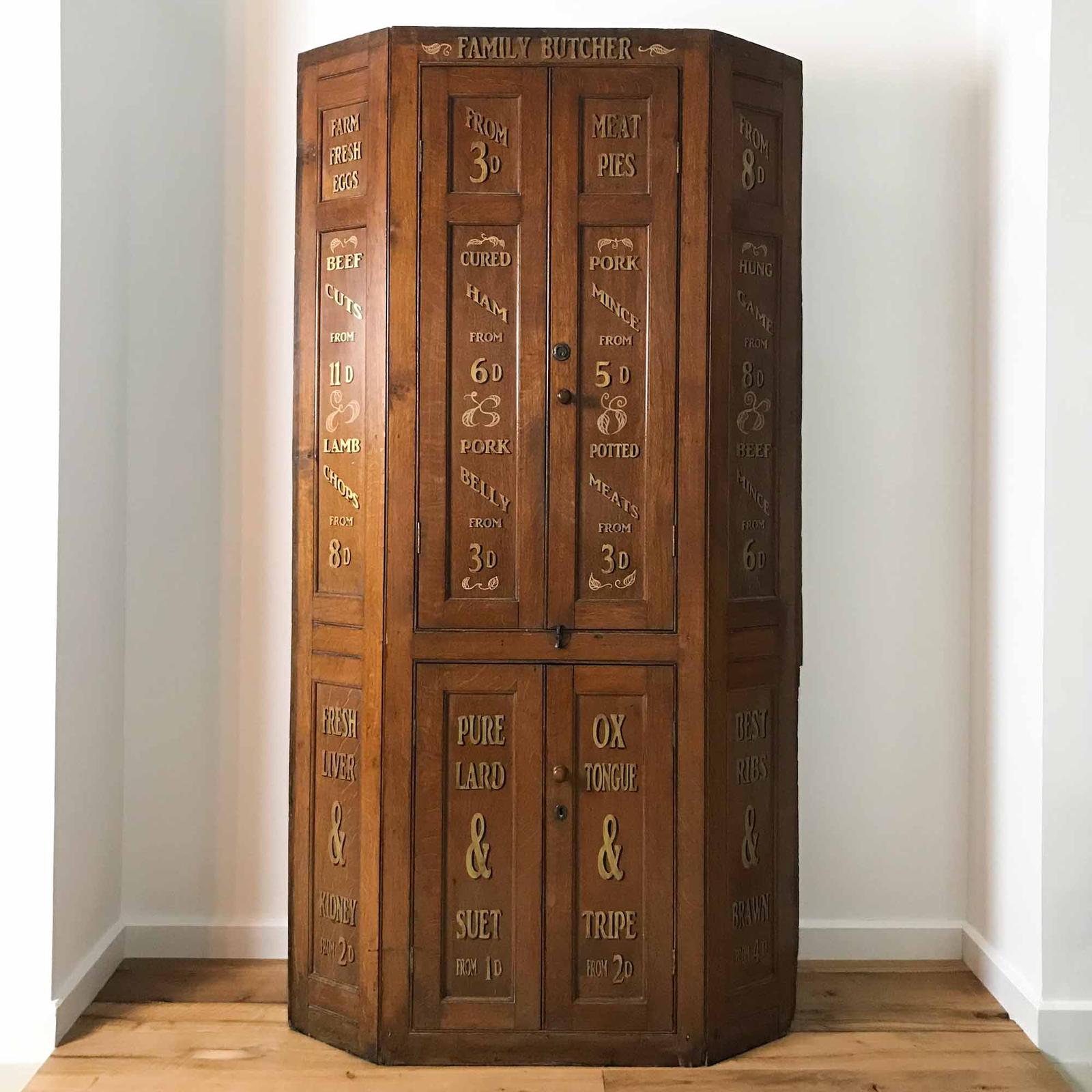 Antique George III Barrel Back Oak Butchers Shop Advertising Cabinet with Later Gilt Sign Writing