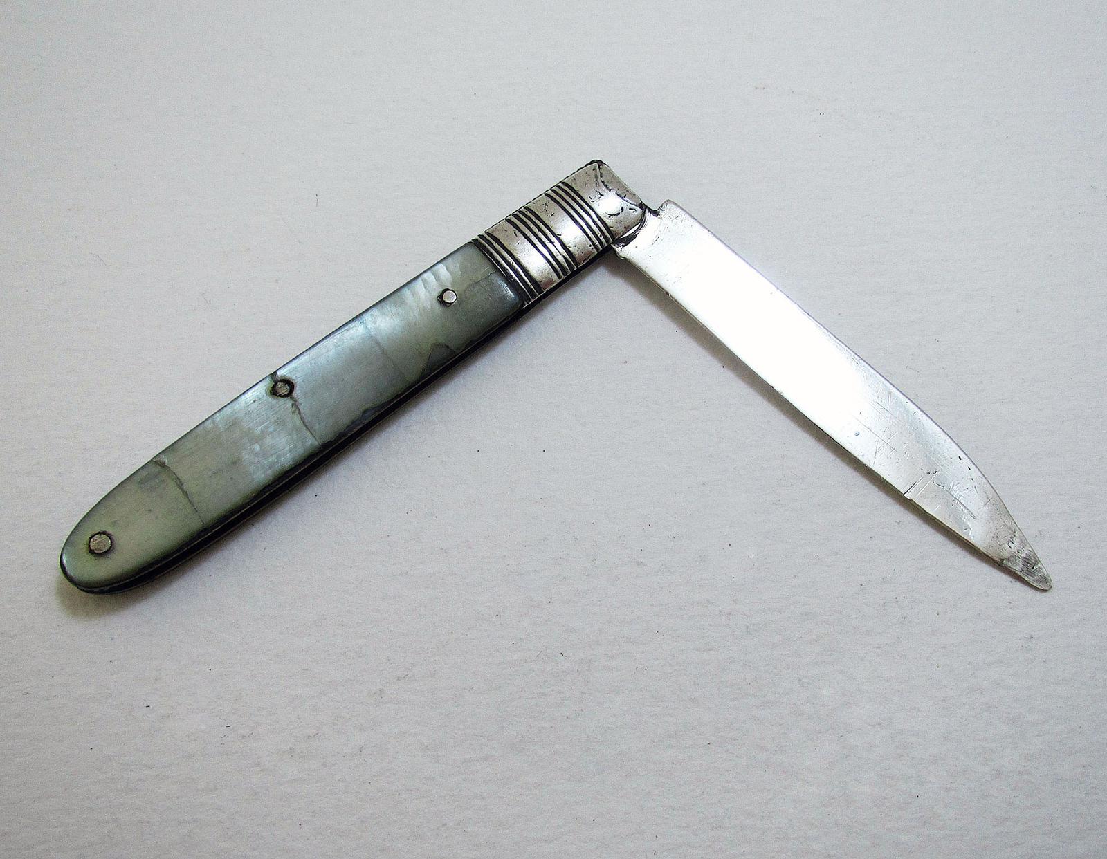 Antique George III c.1800 Small Solid Sterling Silver Mother of Pearl Mop English Georgian Folding Pocket Fruit Penknife