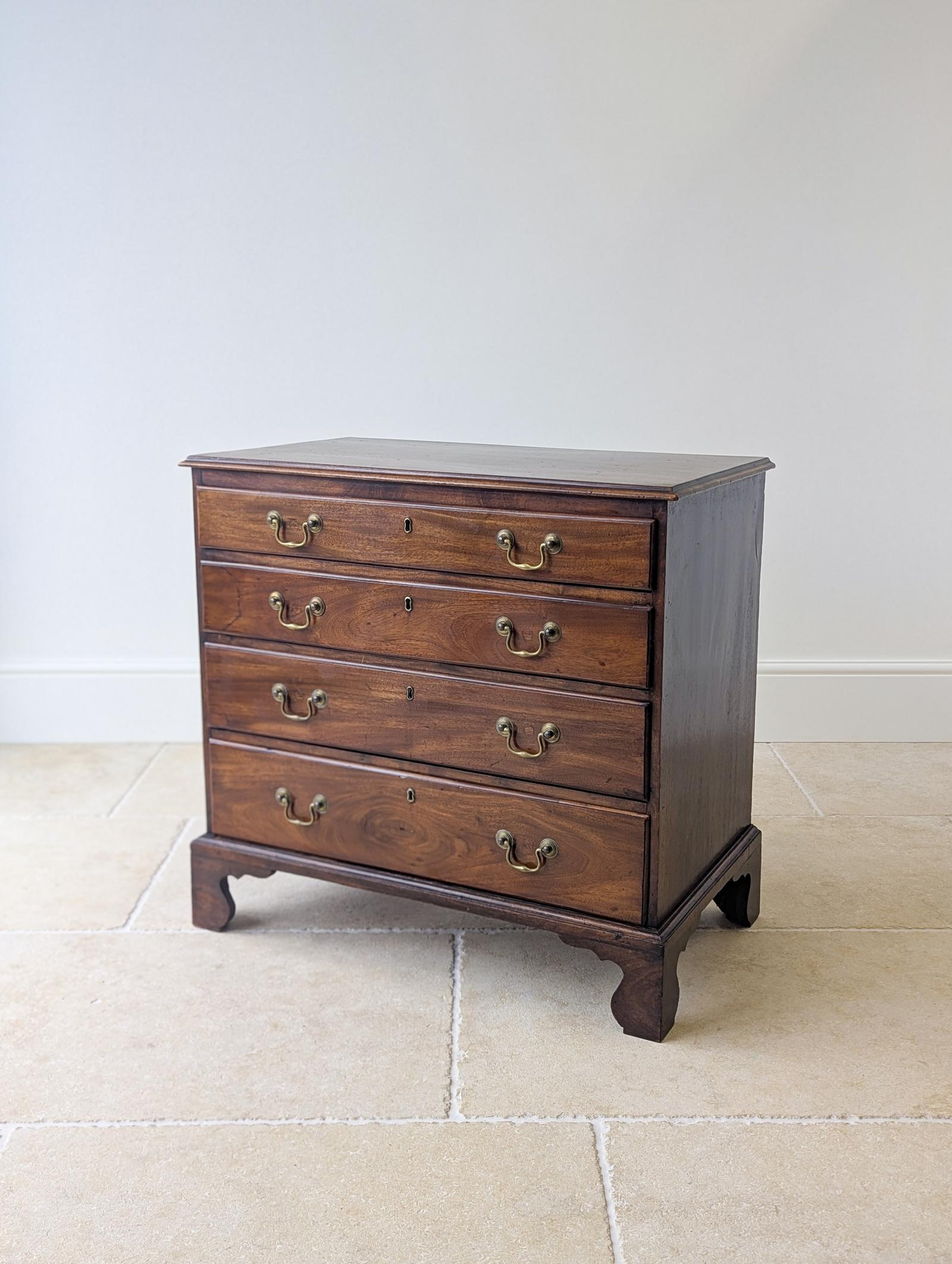 A George III mahogany chest of drawers, the solid mahogany top with moulded edge above four long graduated drawers retaining a warm, even colour and fitted with brass swan-neck handles, all raised on original ogee bracket feet.