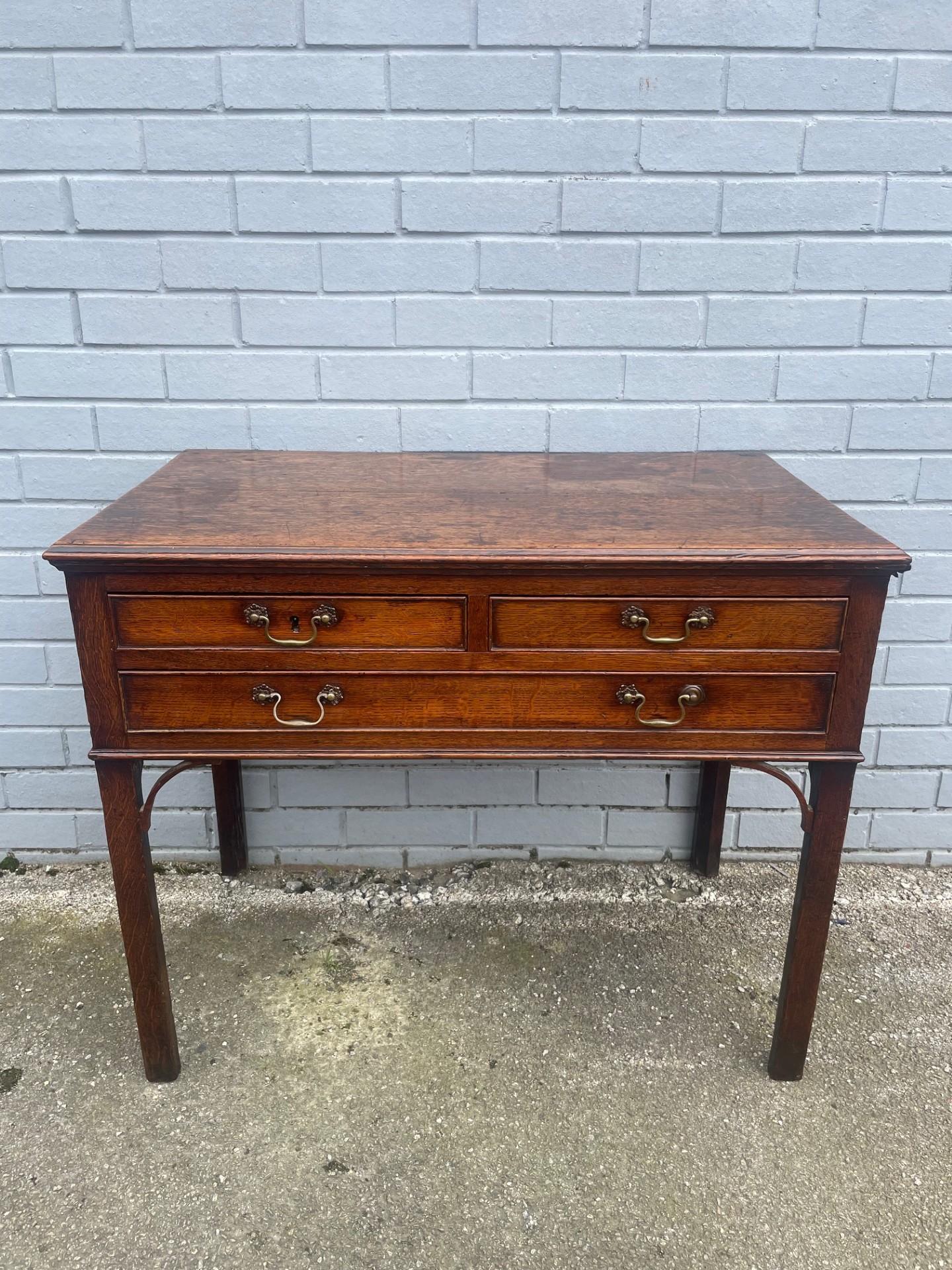 Offered for sale is this George III oak lowboy/side table in oak having 2 small draws over a larger single draw with the original brass handles. Standon on square chamferred legs. Great colour and patina.
