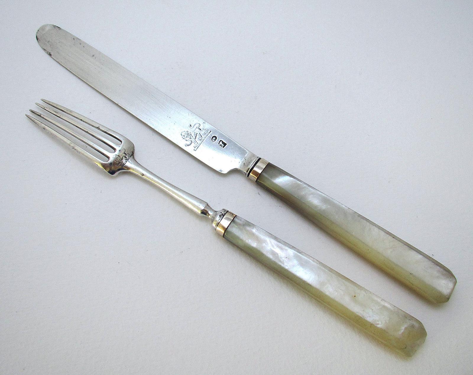 Antique George III Solid Sterling Silver Mother of Pearl Georgian Pair Dessert Knife & Fork Set c.1800
