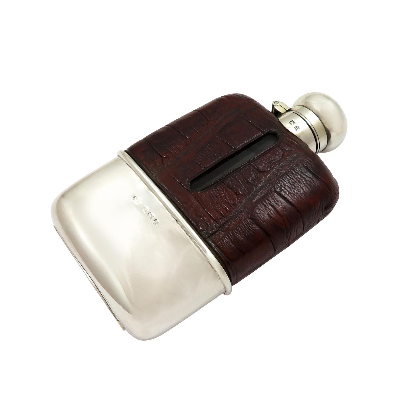 Antique George V Sterling Silver & Crocodile Leather Hip Flask 1918