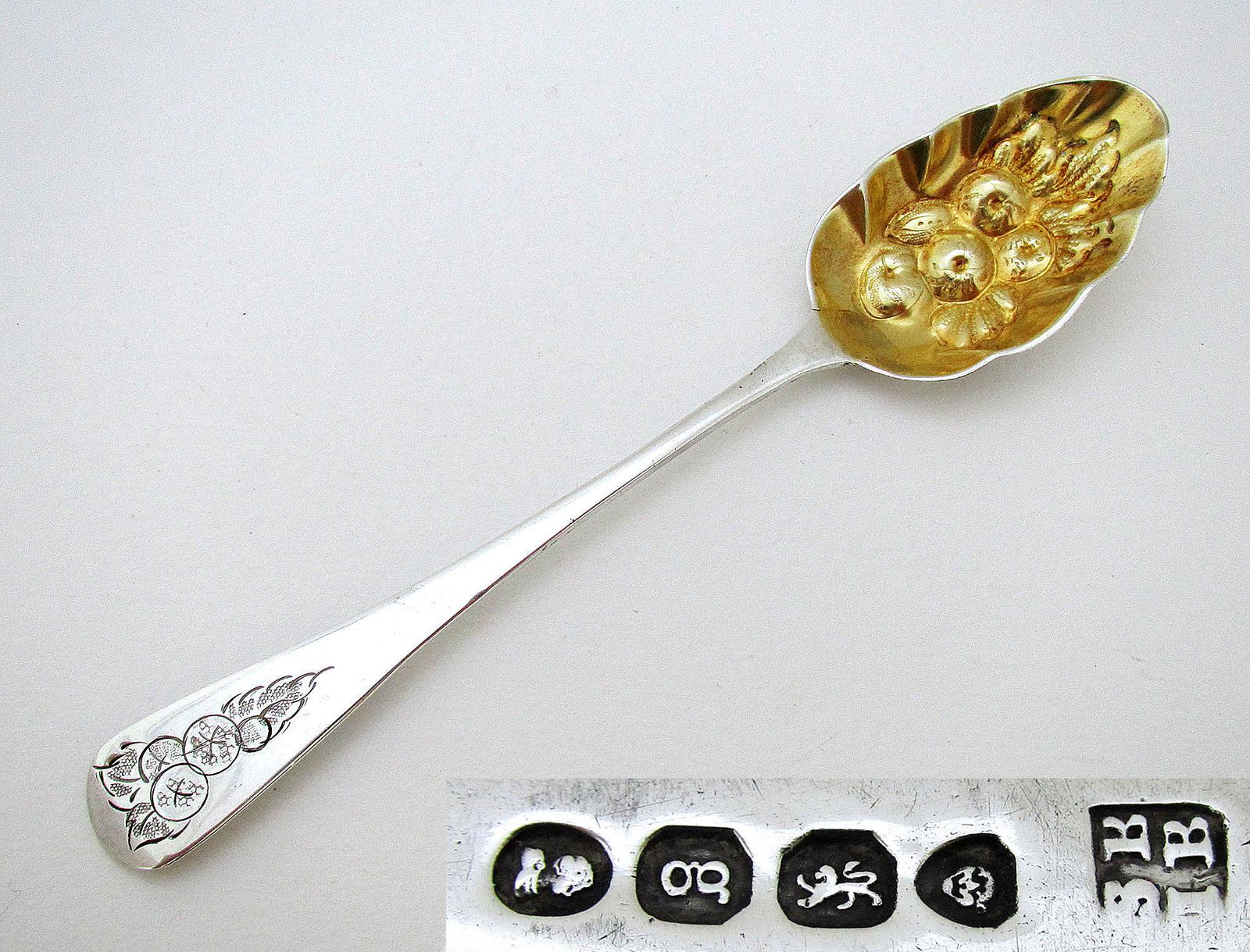 Antique Georgian 1822 Solid Sterling Silver Gilt English Tea Dessert Fruit Small Berry Spoon. Sarah & John William Blake