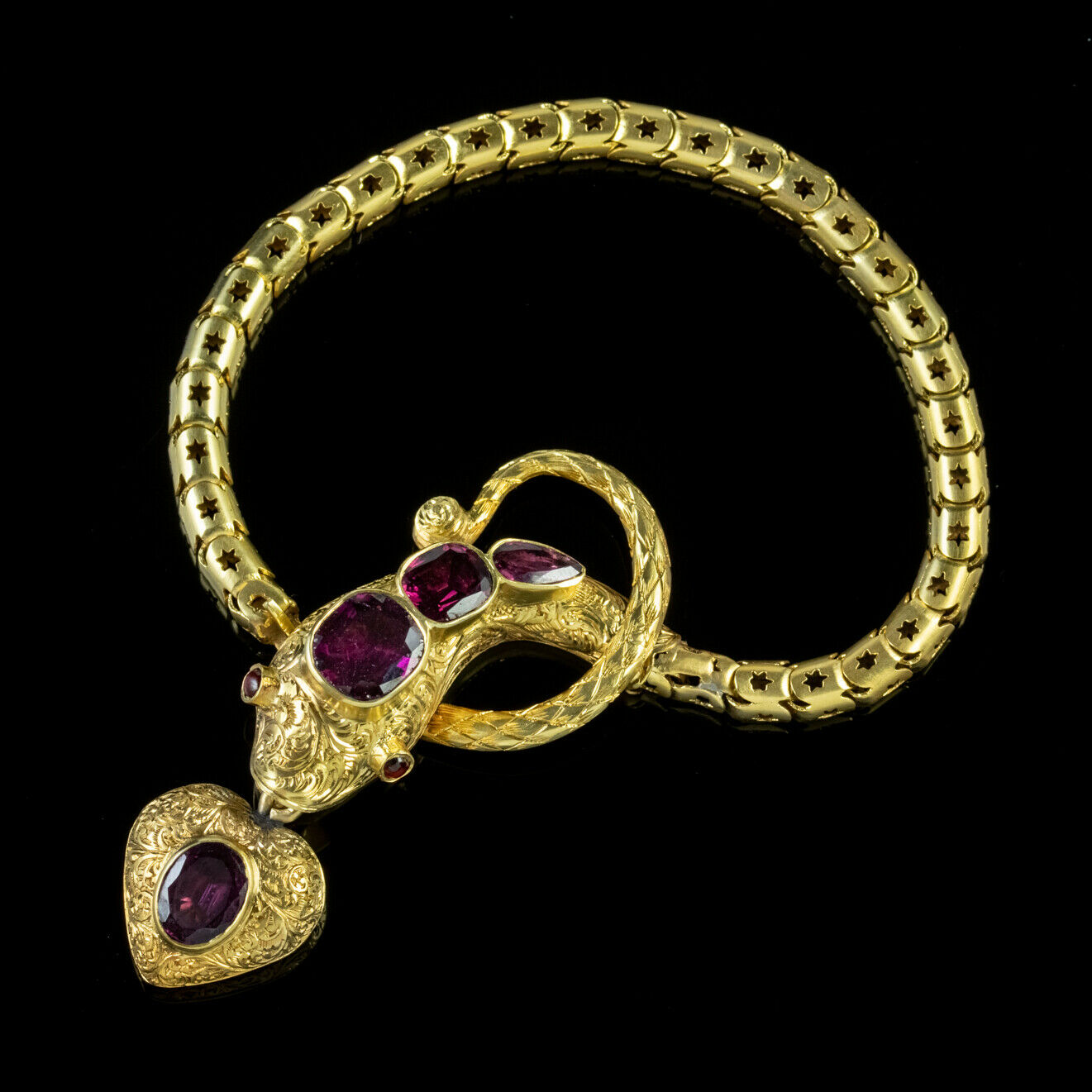 Antique Georgian Almandine Garnet Snake Bracelet 18ct Gold Heart Locket c.1820