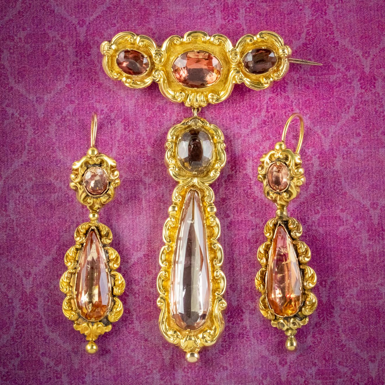 Antique Georgian Brooch & Earring Set 18ct Gold Pink Quartz + Paste Circa 1800 Boxed