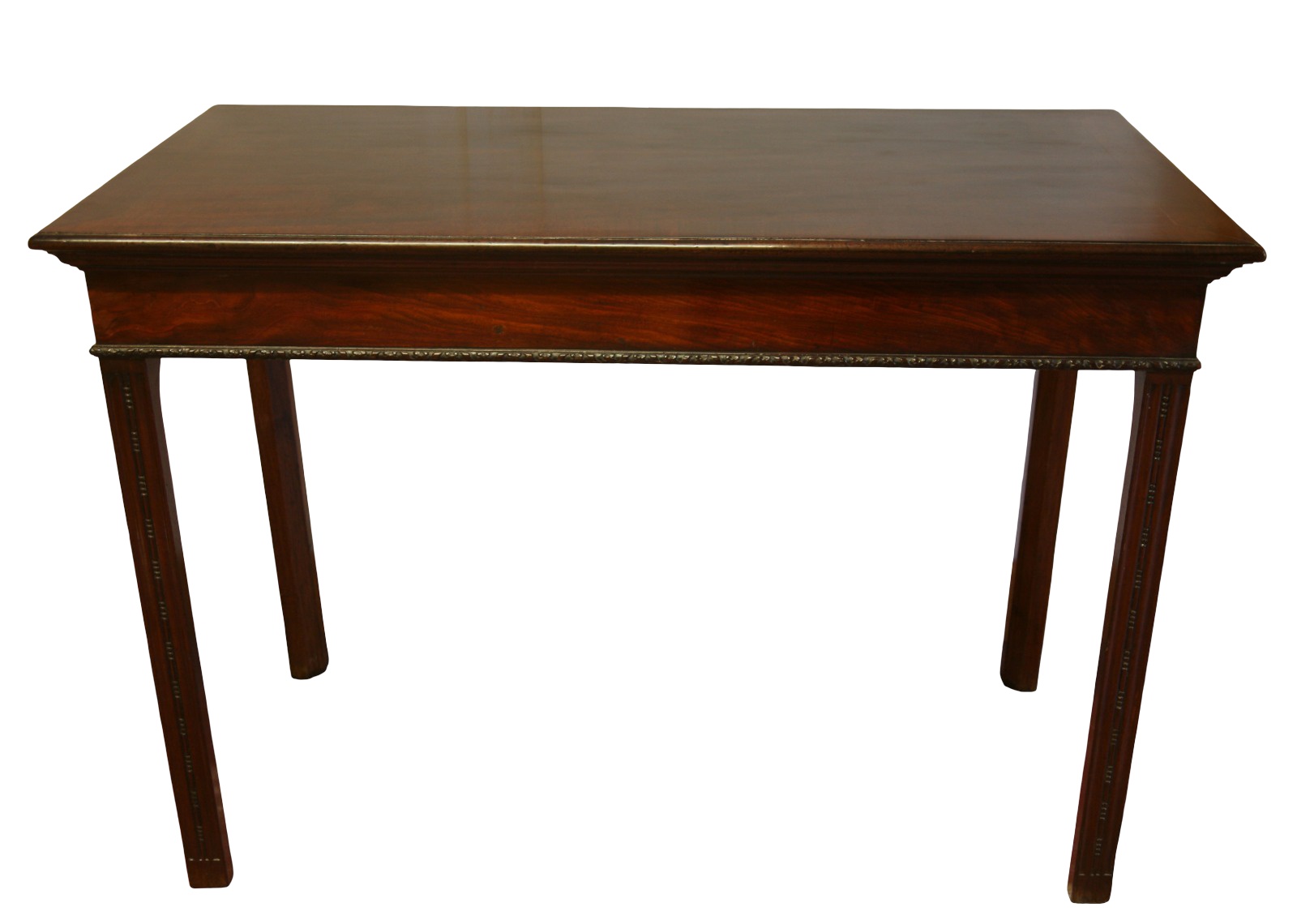 This is an 18th Century antique mahogany Chippendale table. The square legs chamfered on the inside edge, molded, beaded and fluted. The frieze with molded edge, relieved with carved floral motif.