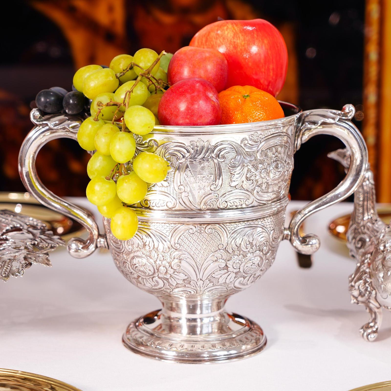 Antique Georgian Irish Solid Silver Large (1kg+) Two Handled Cup/Wine Cooler with Beautiful Floral Chasing - Dublin 1726