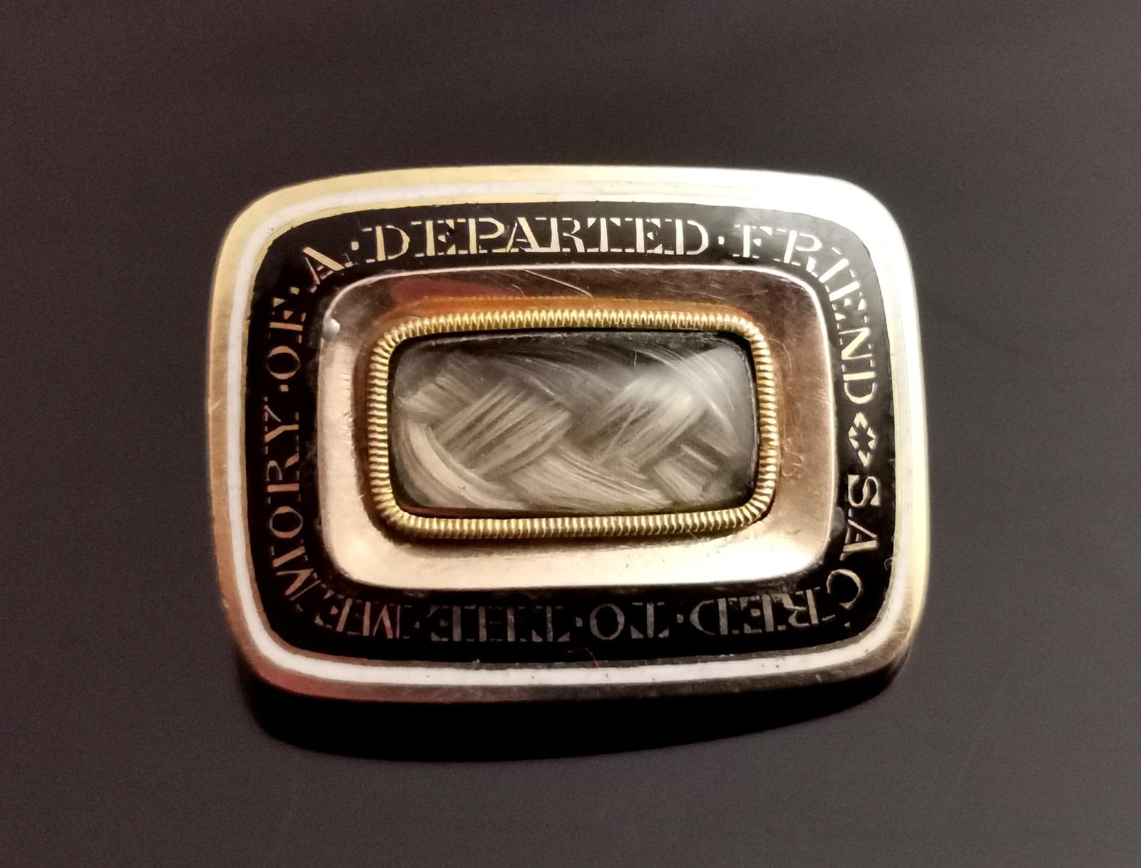 Antique Georgian Mourning Brooch, 9ct Gold, Hairwork, Enamel