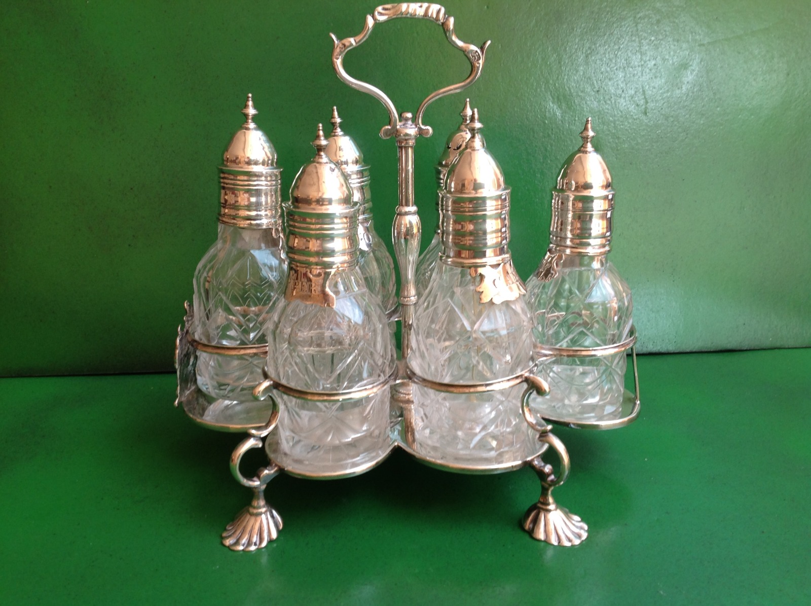 Antique Georgian Silver 6 Bottle Cruet Set - 1761