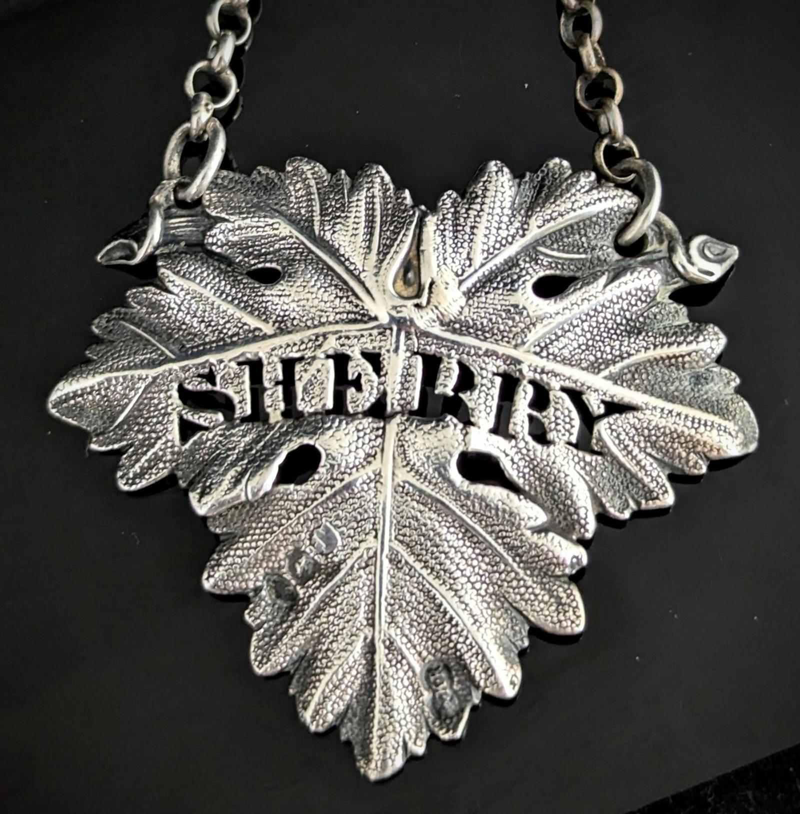 Cut out text reading sherry on a realistic vibe leaf with fine vein detail and stippling to the body of the leaf, there is a curling tendril to the corner and the label retains the original sterling silver, rolo link chain to hang around the neck of the decanter.