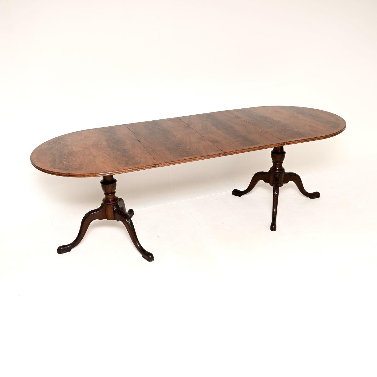 It has a beautiful walnut top with stunning walnut grain patterns and cross banded edges. Each half sits on a pedestal tripod base with acanthus leaf carving at the knees. This come with two additional leaves which extends the top from a six seater to an eight seater and then to a ten seater.