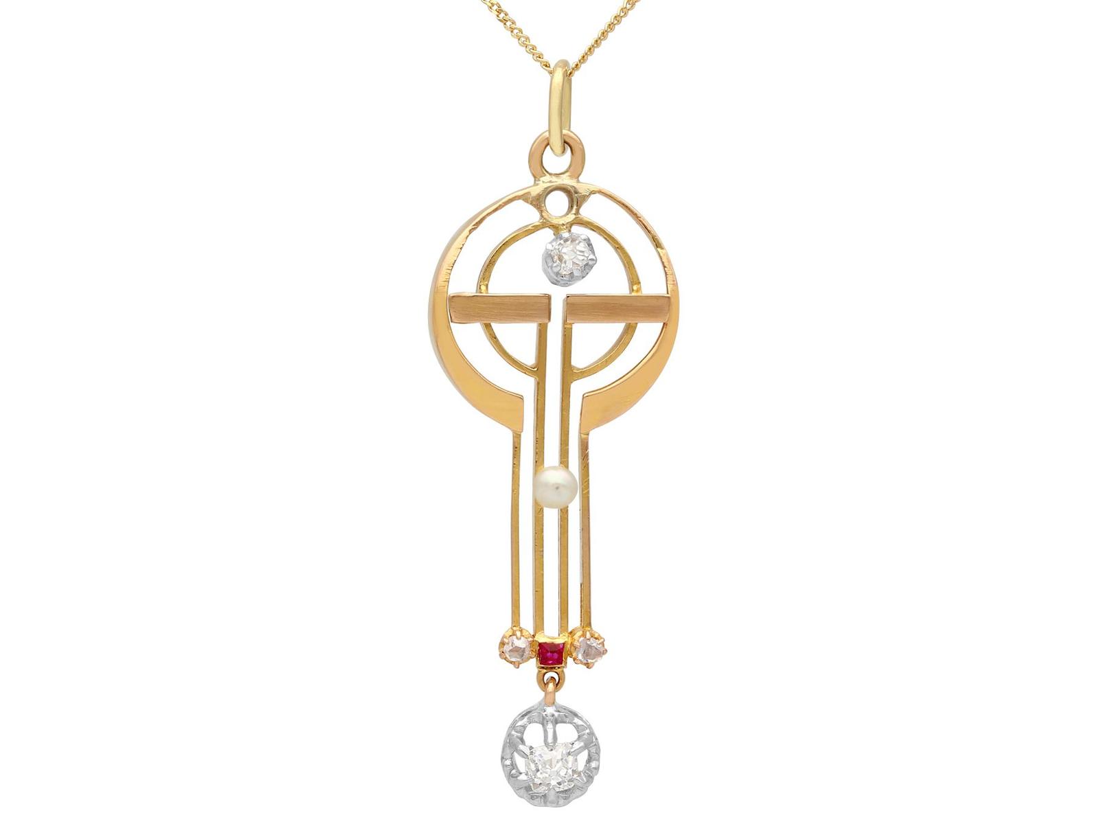 Antique German 0.60ct Diamond & Pearl Ruby & 18ct Yellow Gold Pendant c.1920