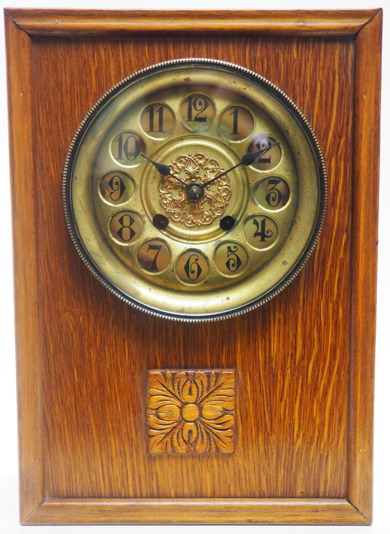 Antique German Arts & Crafts Mantel Clock Carved Detail 8 Day Mantle Clock