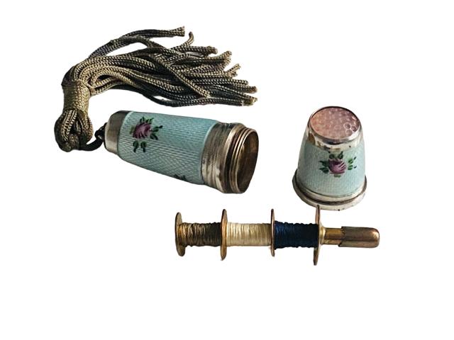 Antique German Sterling Silver & Guilloche Enamel Sewing Etui Thimble and Bobbin