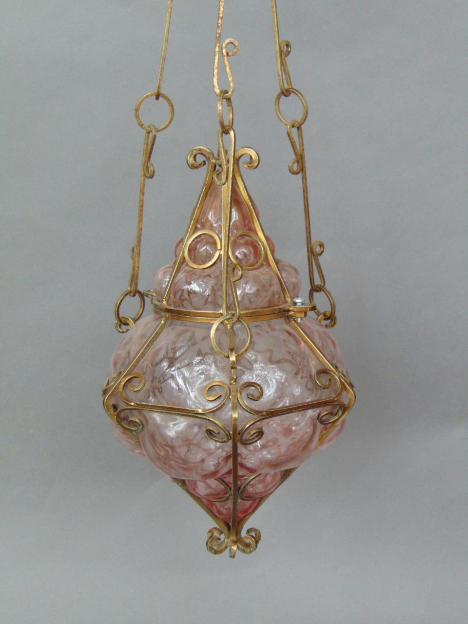 Antique Gilt Metal & Pink Glass Hanging Light c.1910