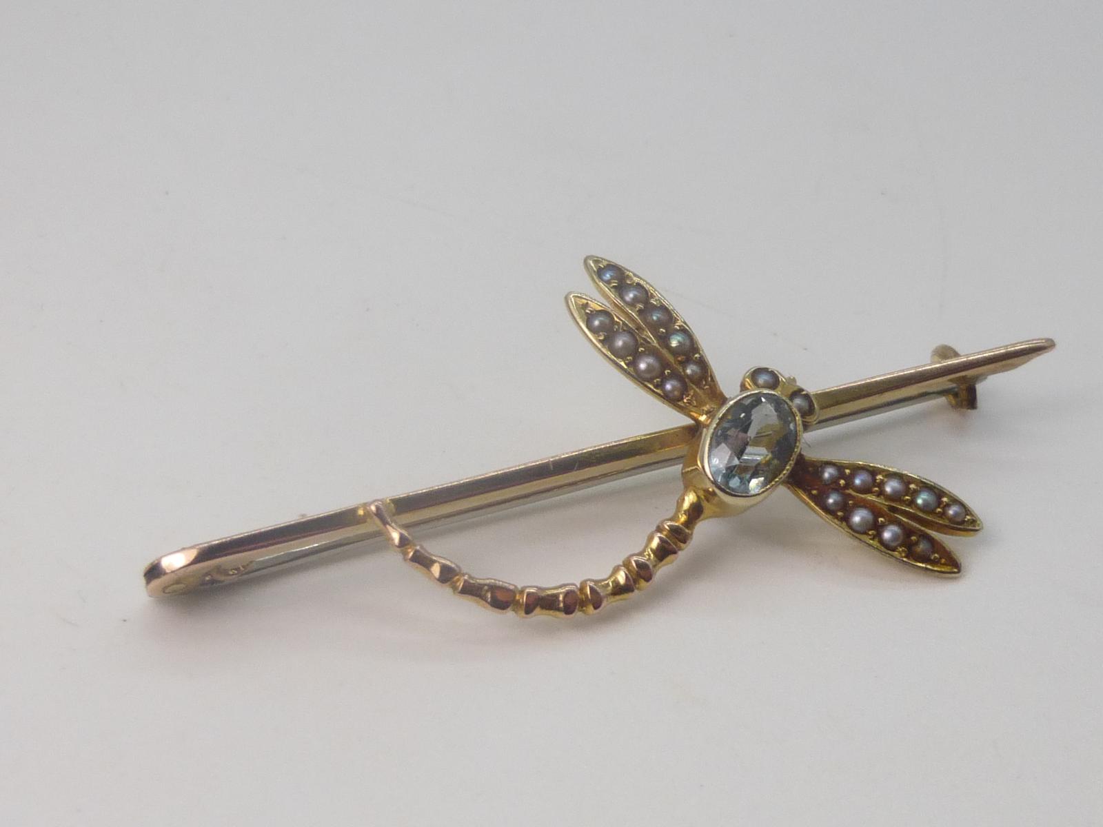 Antique Gold and Aquamarine Dragonfly Brooch