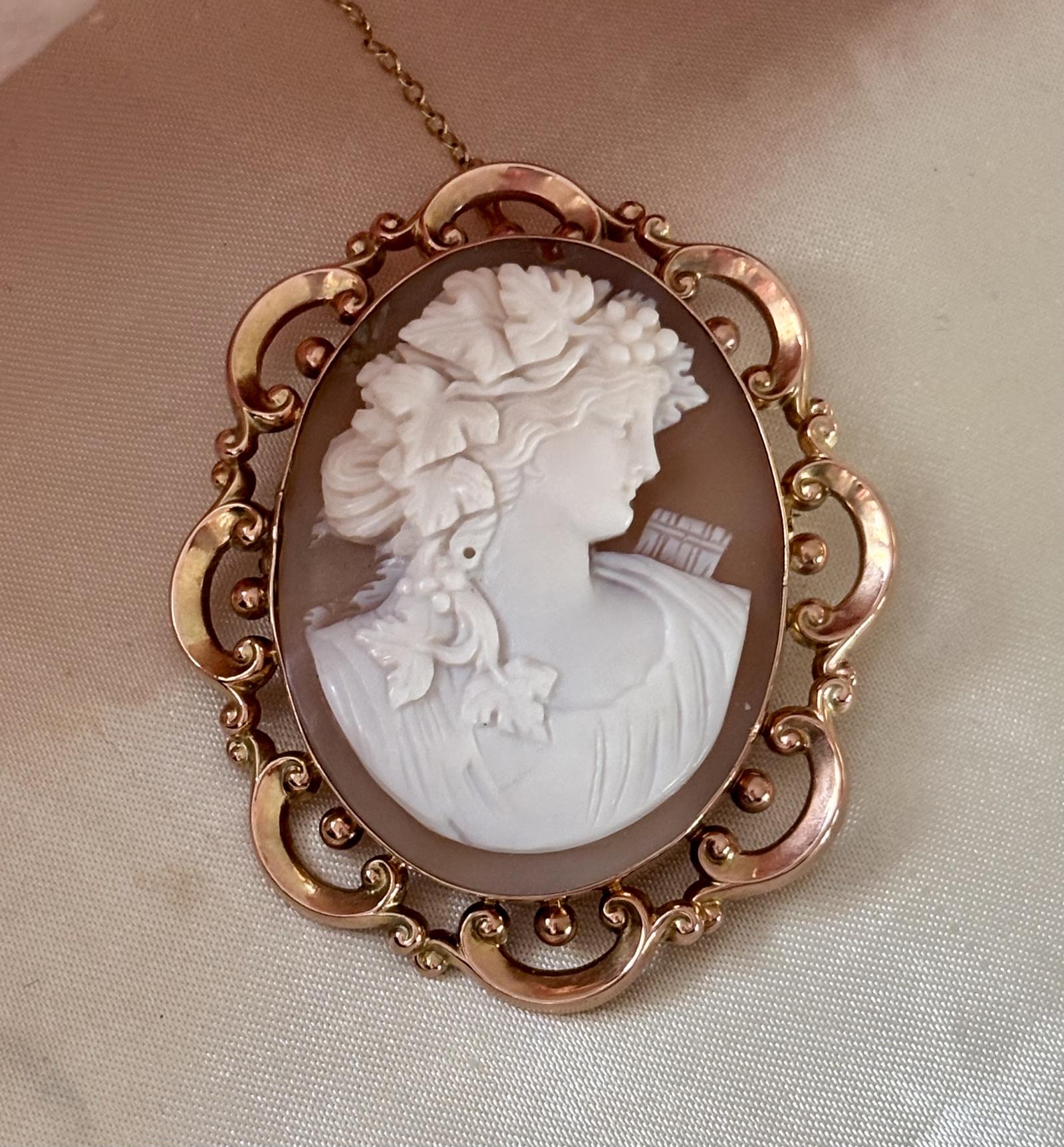 A gorgeous antique cameo brooch set in 9ct gold, depicting a lady. Complete with safety chain. The bar is later. Excellent condition, one very small hole in the cameo, marked 9ct. Please see photos for details. Good preowned condition. 5.5cms in length 4.5 cms wide.