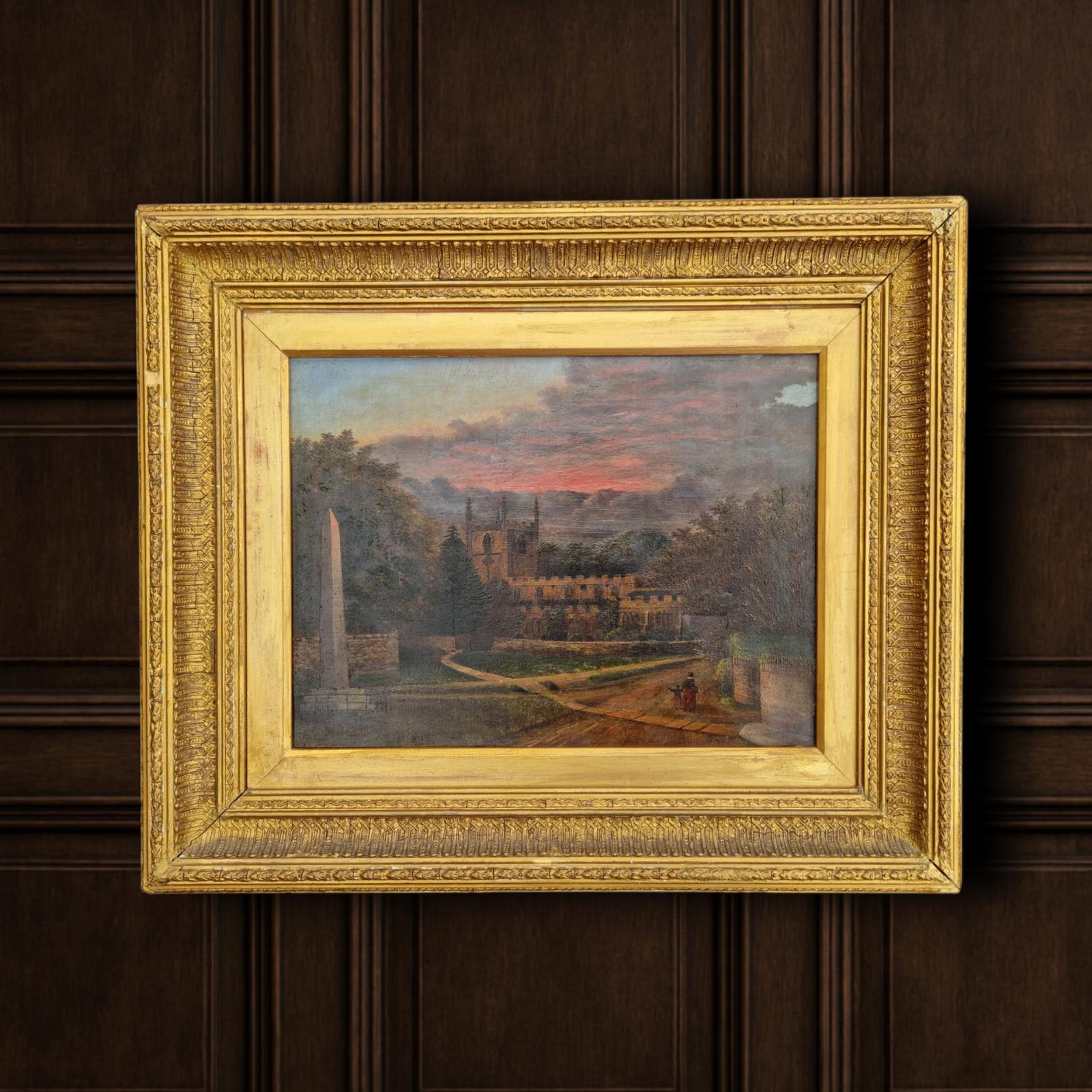 Antique Gothic Oil Painting Of Norton St James Church, Victorian 19th Century