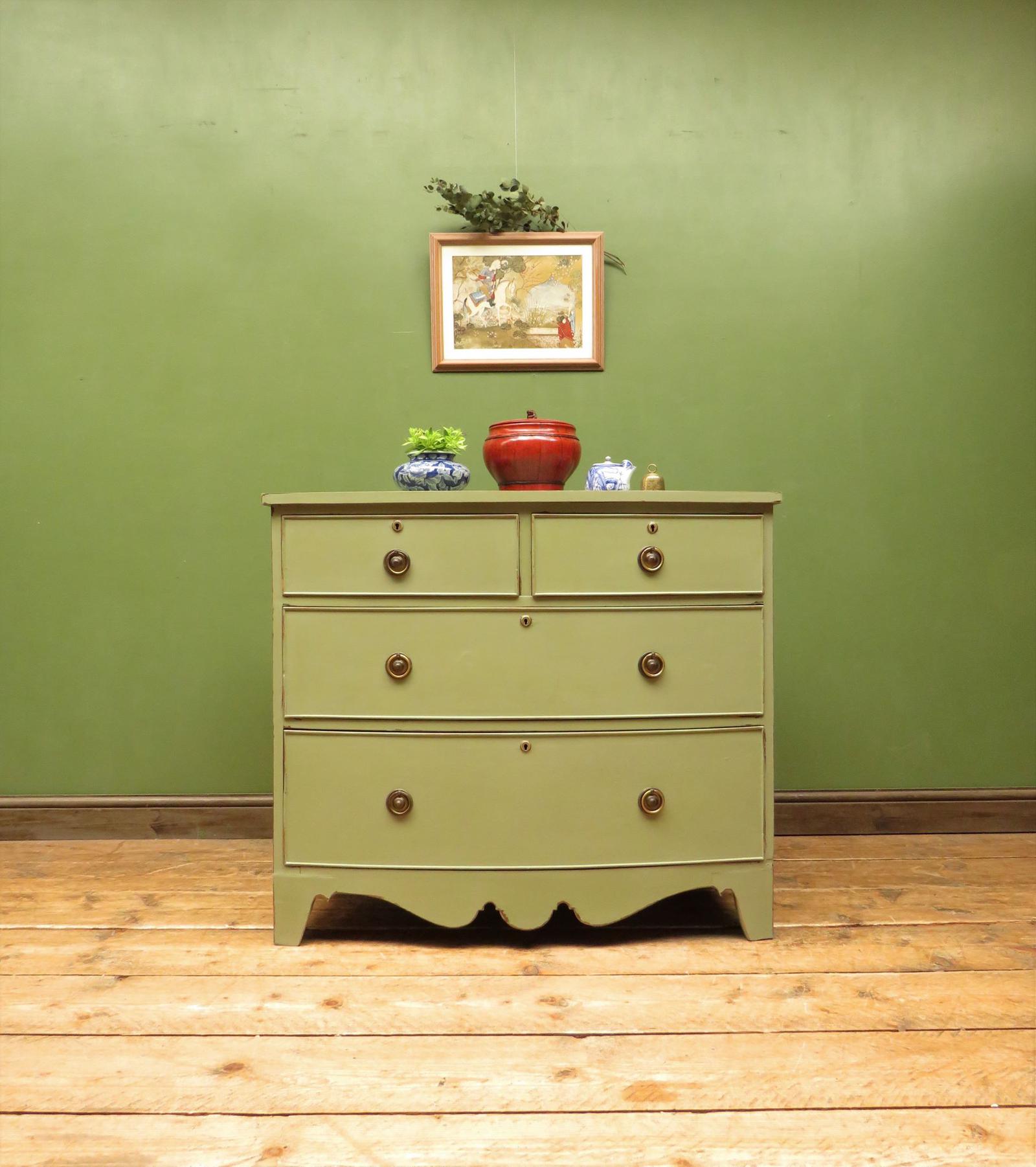 Antique Green Bow Fronted Chest of Drawers, Shabby Chic