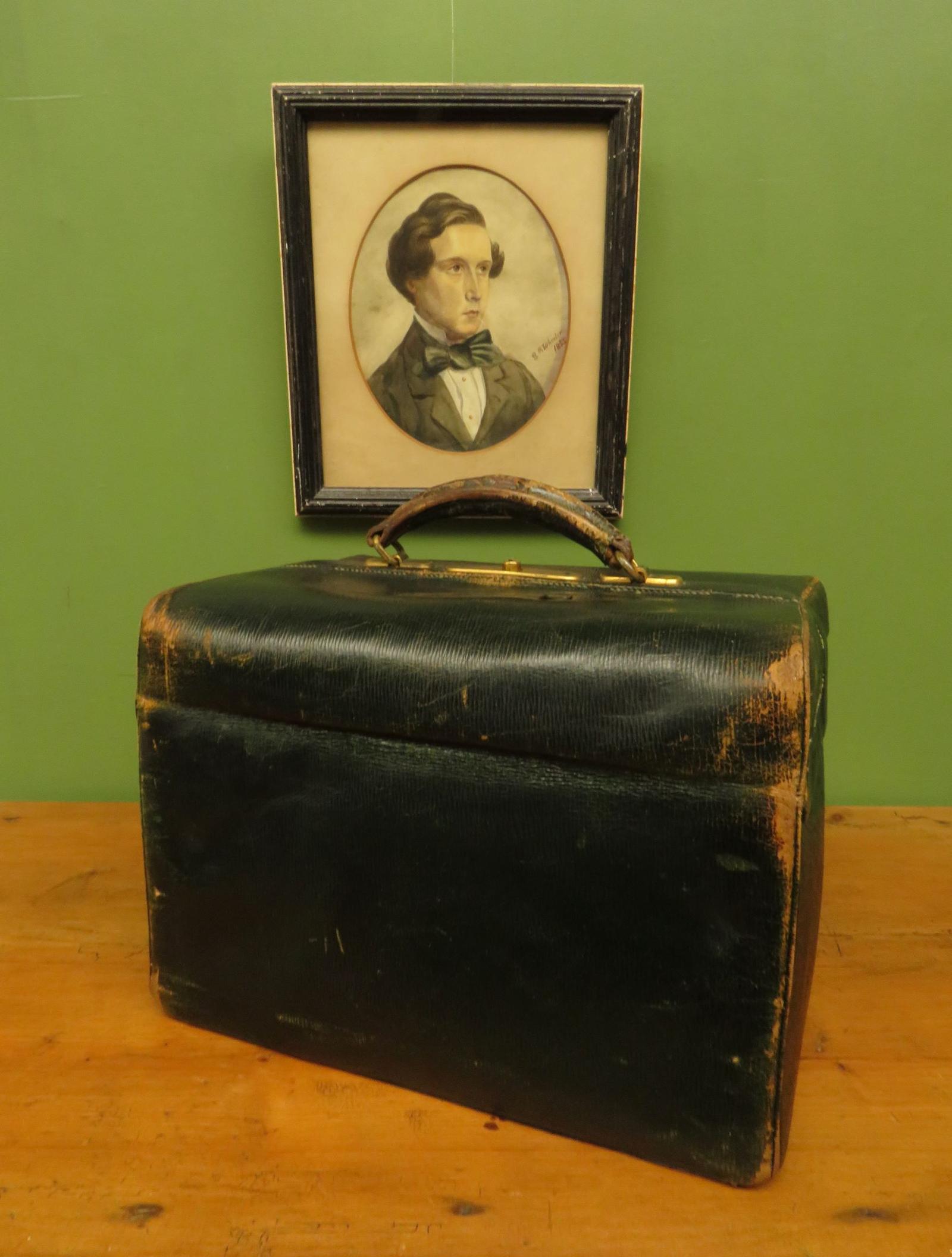 Antique Green Leather Doctors Gladstone Bag With Initials F.G.