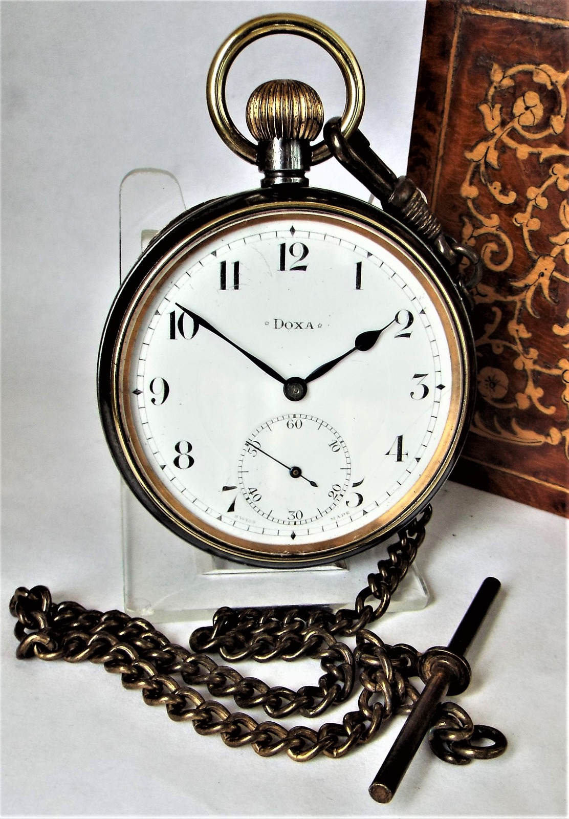 Antique Gun Metal Doxa Pocket Watch with Chain