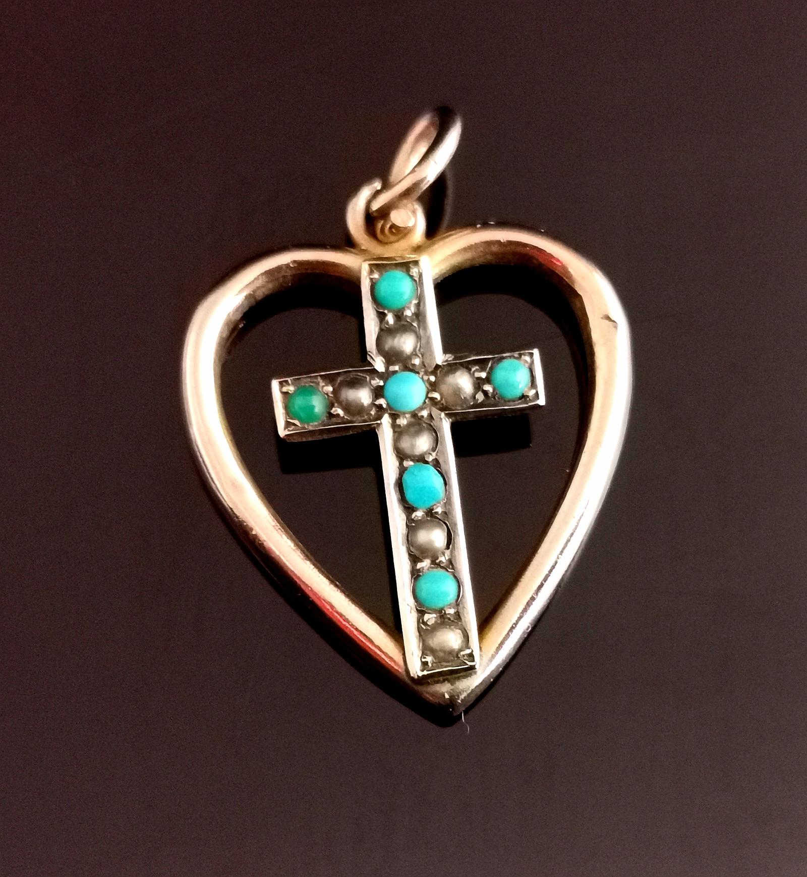 Antique Heart & Cross Pendant, 9ct Rose Gold, Turquoise & Seed Pearl