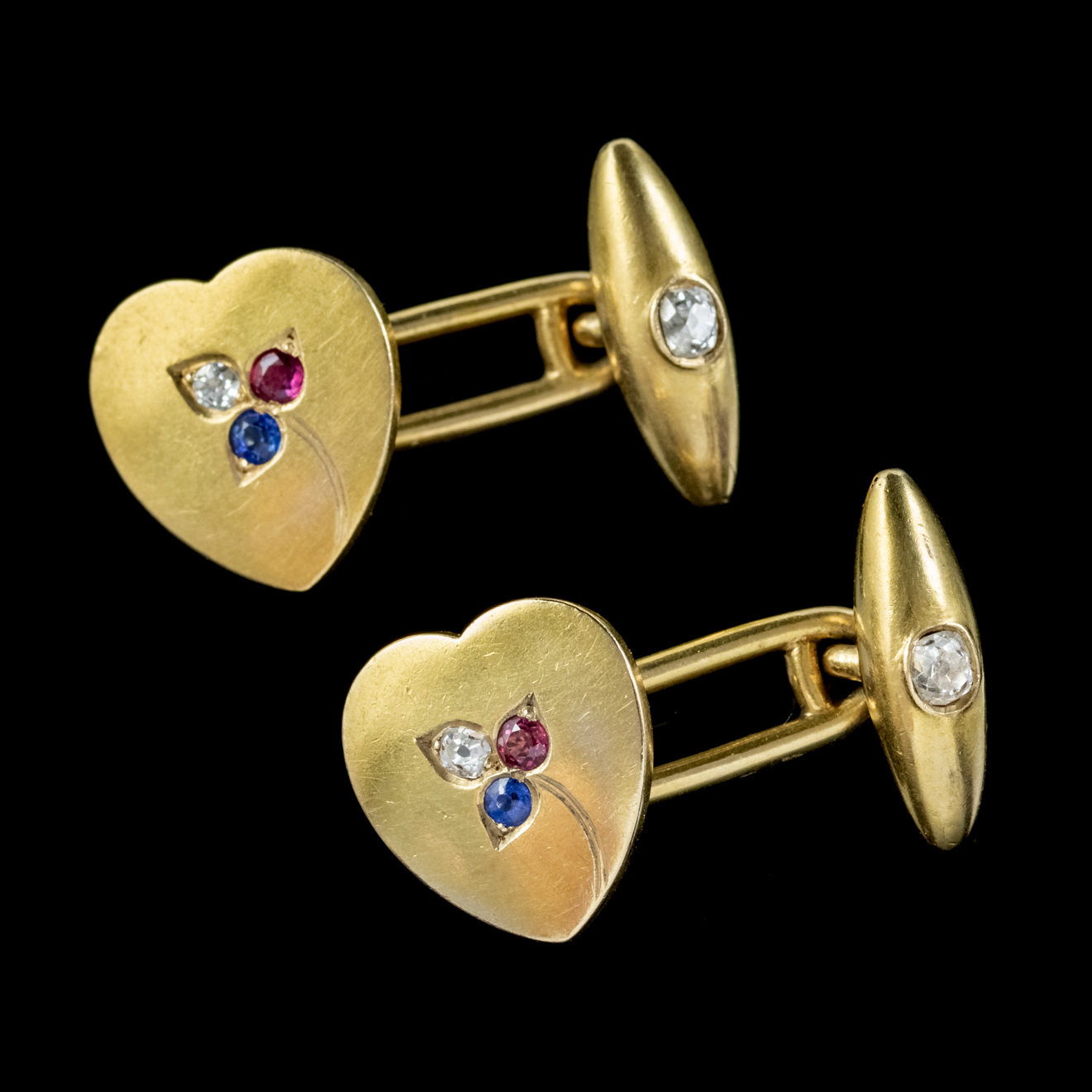 Antique Heart Cufflinks Ruby Sapphire Diamond 18ct Gold Garrard Box c.1890