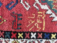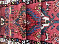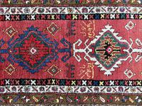 A fabulous antique Heriz runner, woven in the first quarter of the C20th. The design features a series of geometrical medallions on a terracotta field surrounded by an ivory and camel border. There’s a lot to like - full pile, great colours, figures and even the weaver’s signature (Rasoul). There is also a date, however it's quite difficult to read. Some of my esteemed colleagues believe it is 1319 (making it 1901) while others suggest it is 1347 (making it 1929). Either way, it's old (and great). Size: 3.62m x 0.95m (11ft 10in x 3ft 2in) This runner is in good condition with full, chunky pile. Fringes and selvedges are secure and it has been professionally cleaned. Free worldwide shipping.