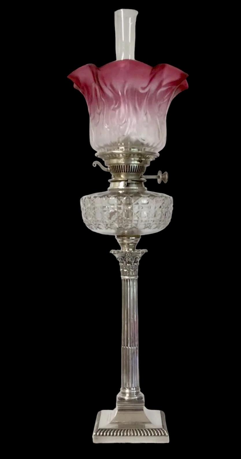 Antique Hinks Silver Plated Oil Lamp Cranberry Glass Shade