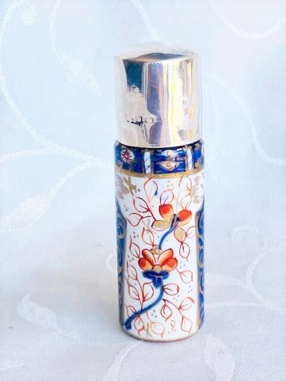 Antique Imari Pattern Porcelain Cylindrical Perfume Scent Bottle Silver Lid Circa 1900