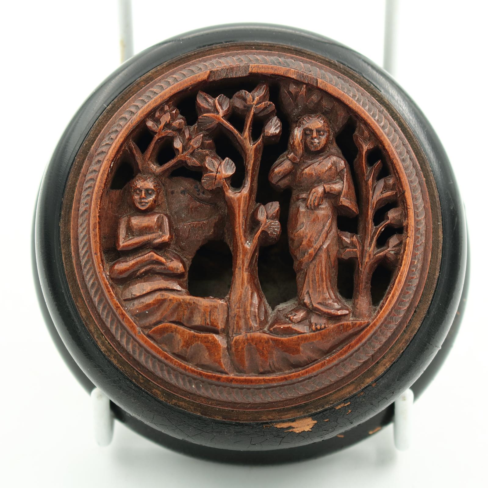 Antique piece in good overall condition, some losses to base ebony paint, couple of losses to wood on the outer ring of the front carving and one small wood split, general signs of age and wear, please refer to detailed photos provided.